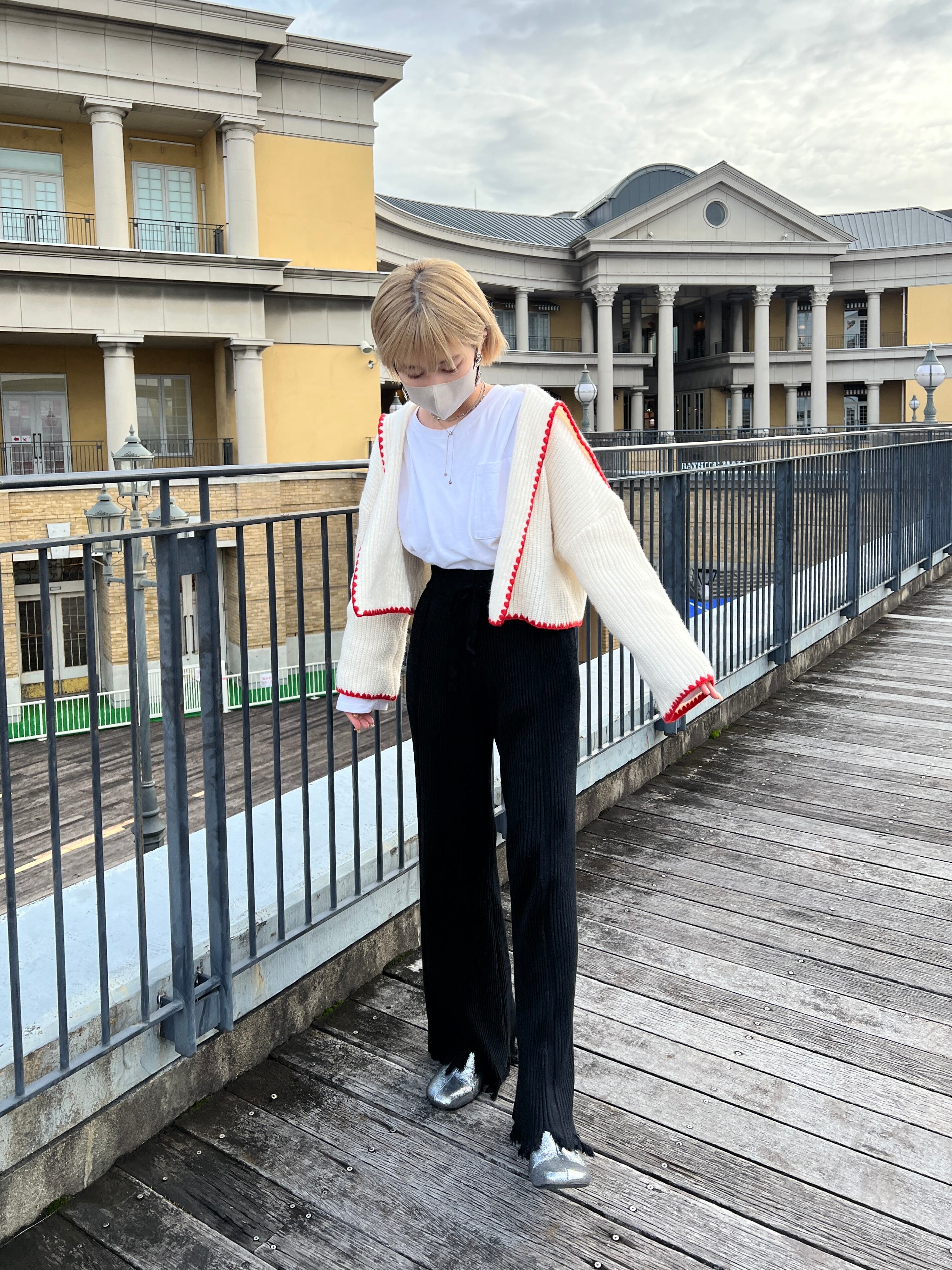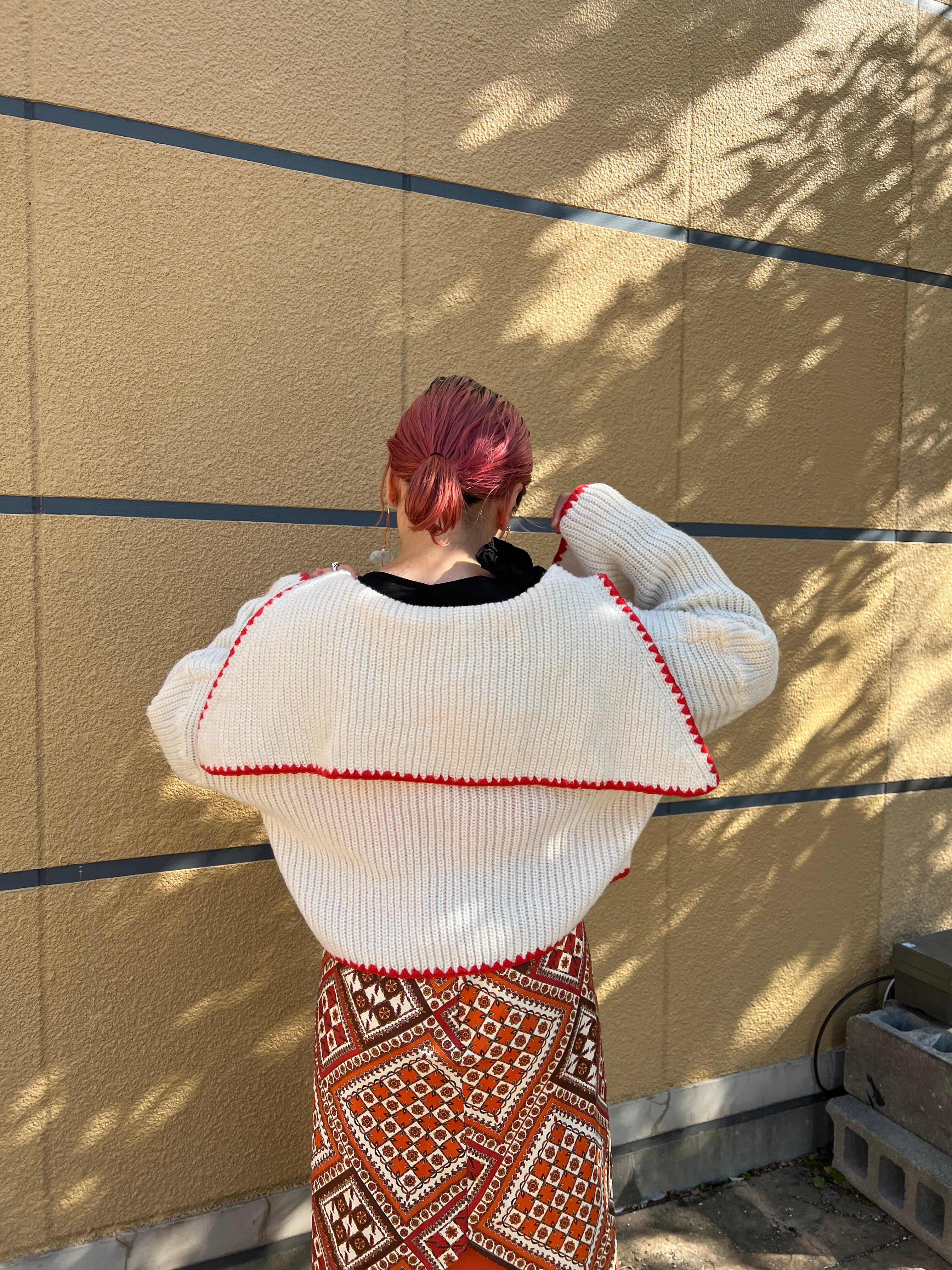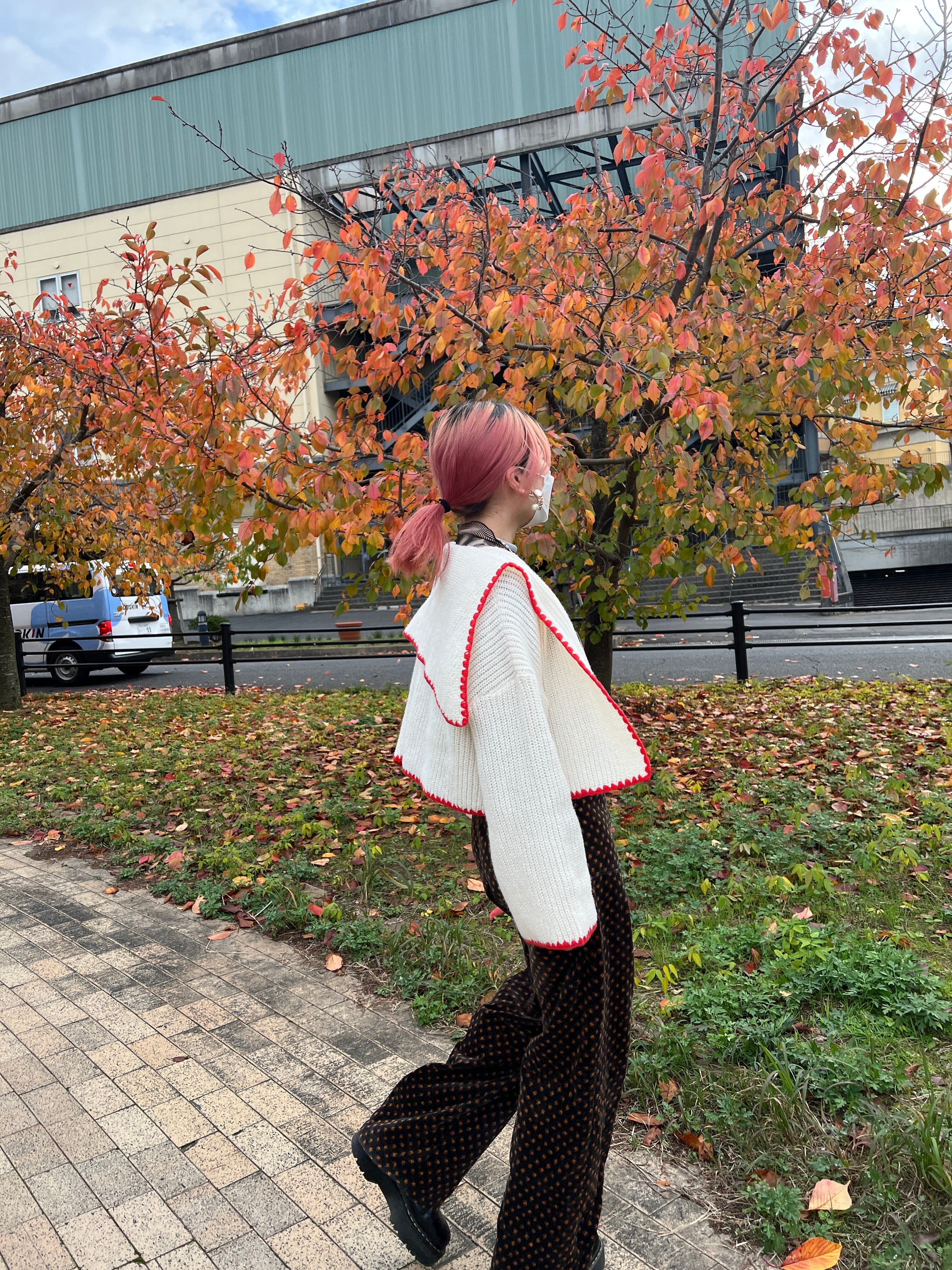 大きな襟とパイピングの刺繍が特徴的なニットカーディガンです。袖も広めなのが可愛いです。