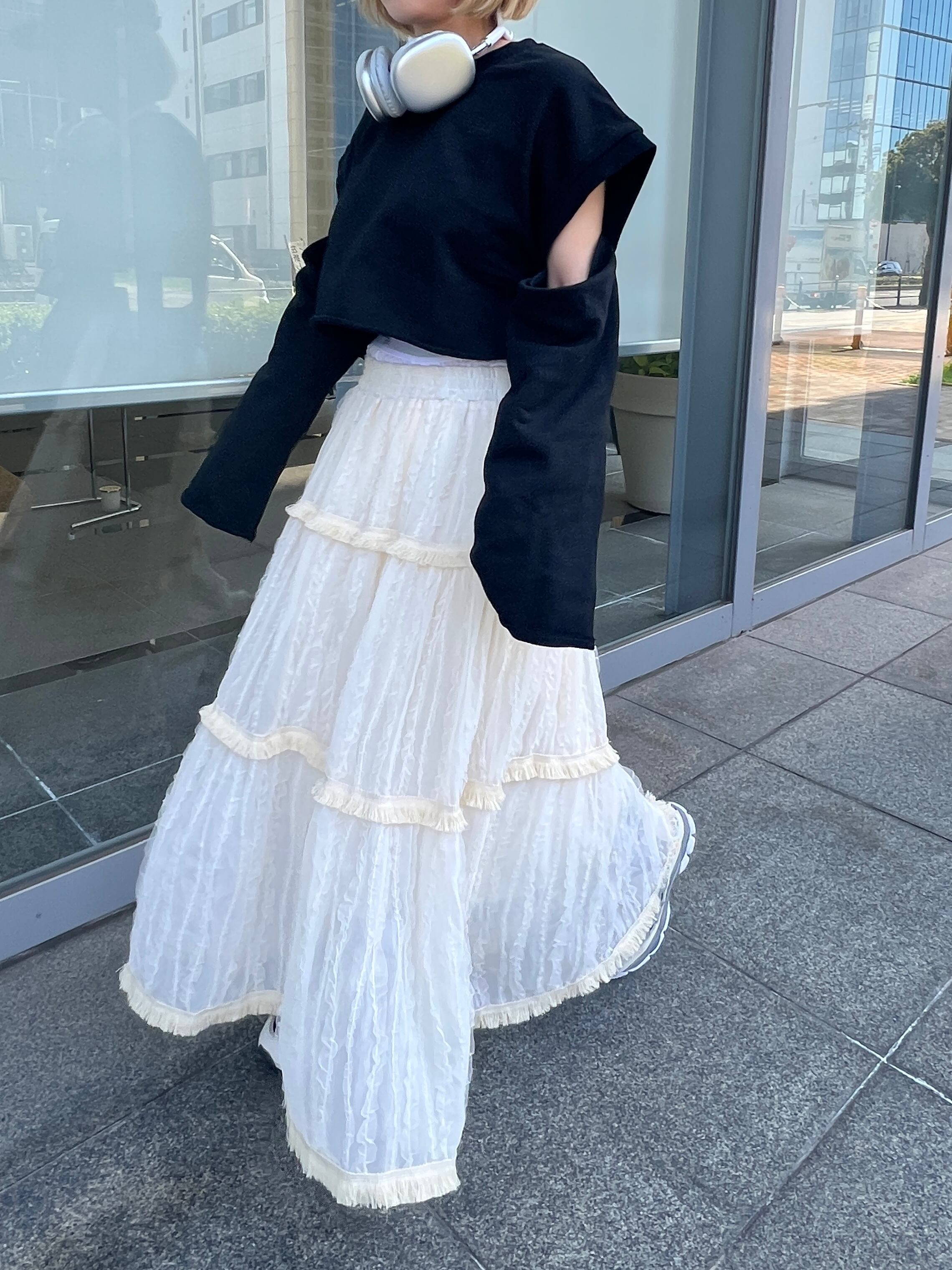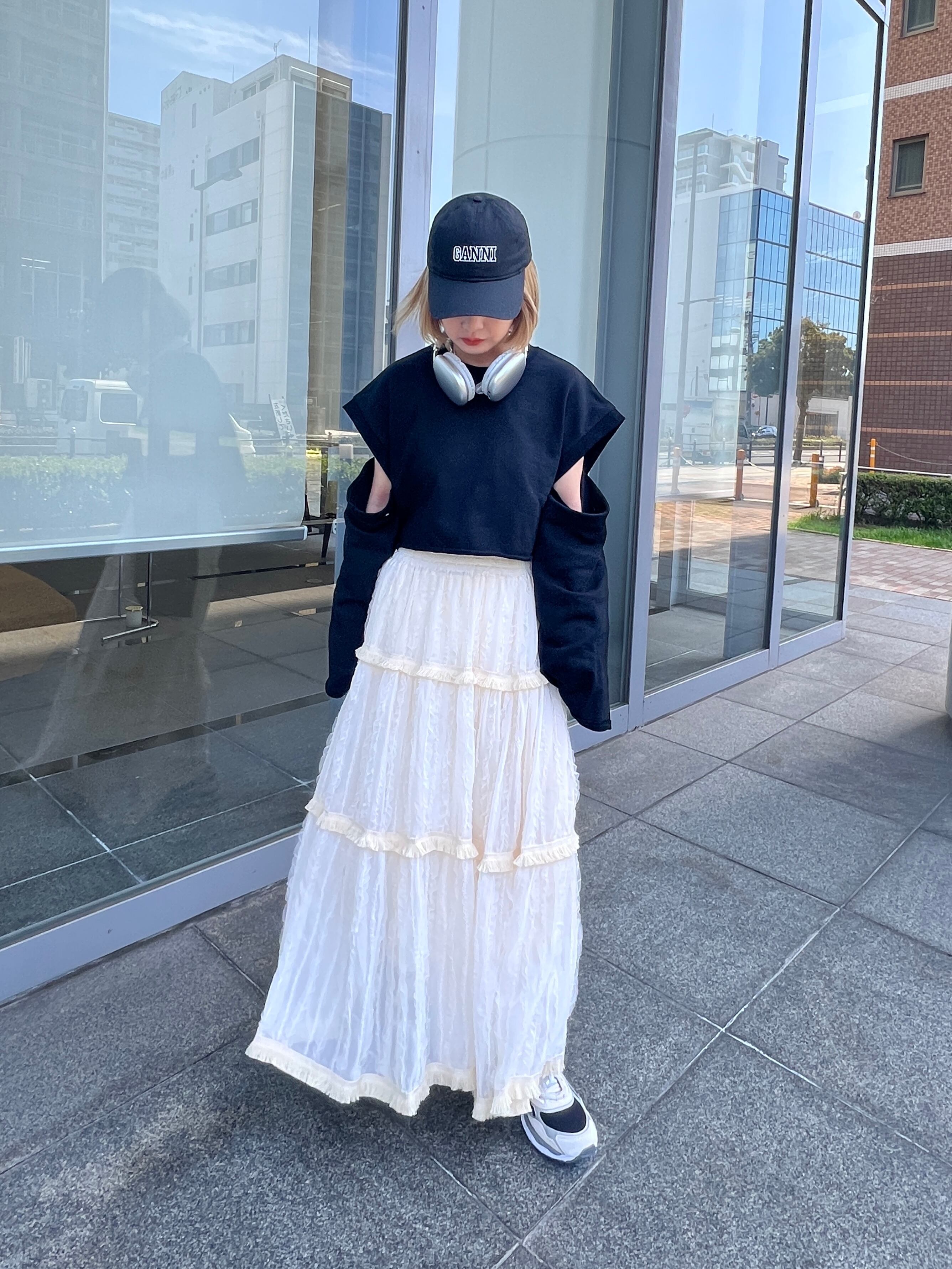 ウエストは総ゴムなのでどんな体型の方でも着用していただけます。ロンTやスウェットとカジュアルに合わせるのがおすすめ。