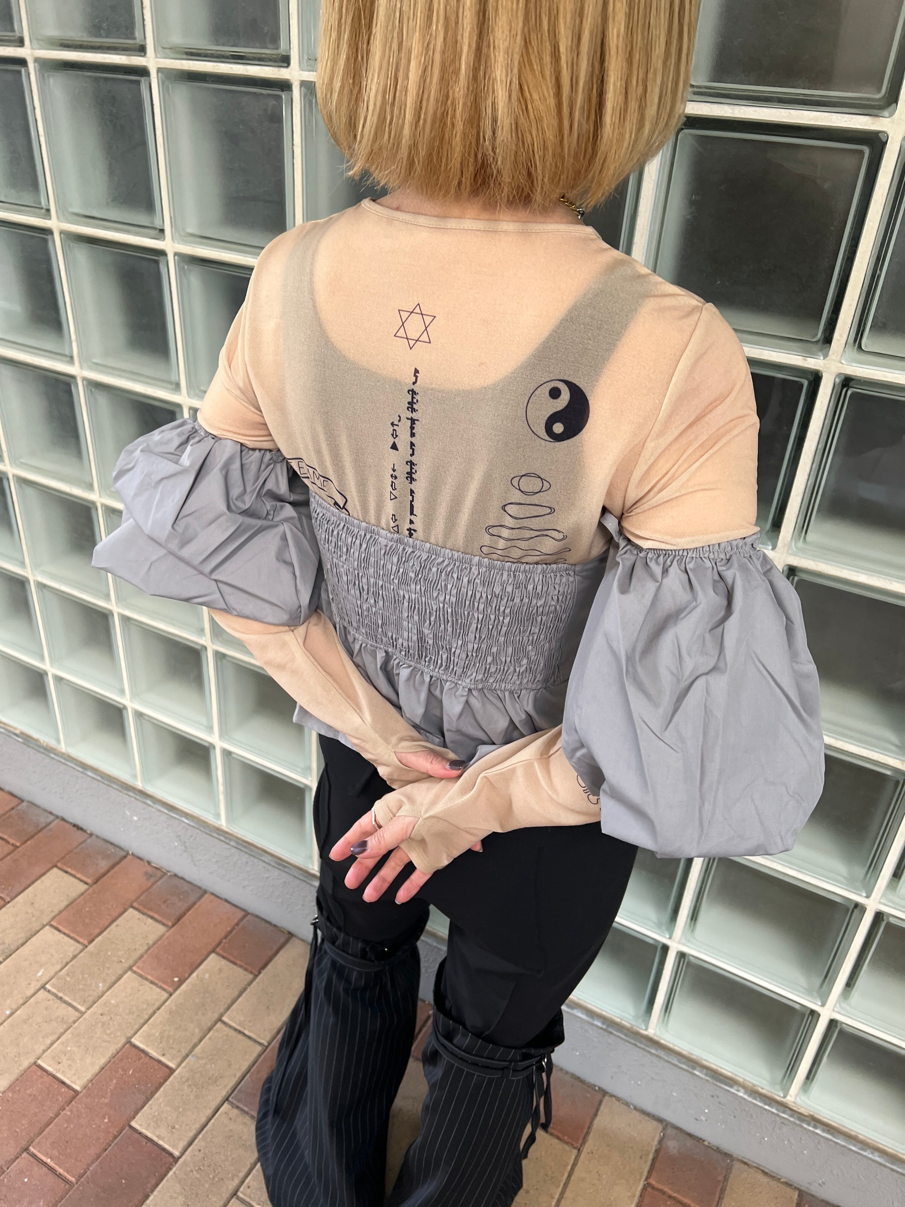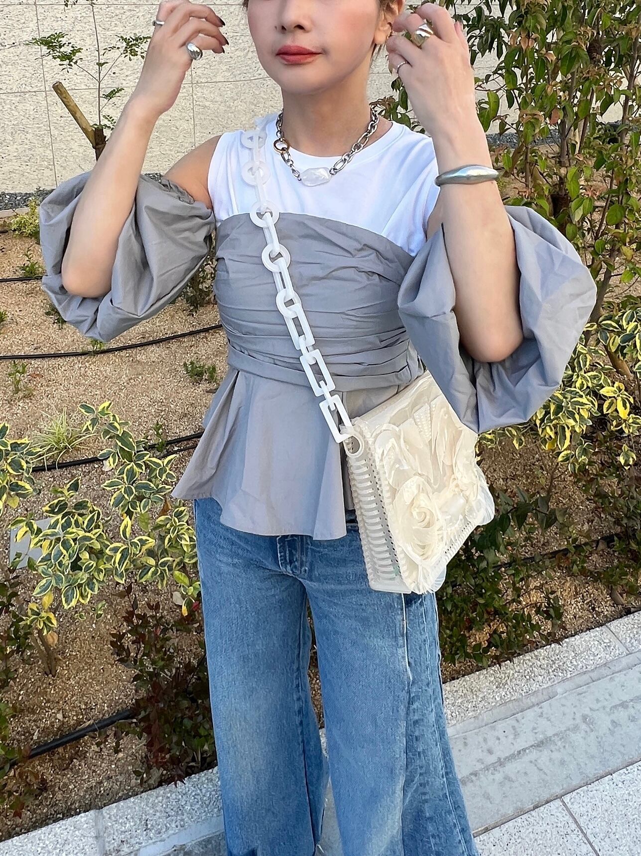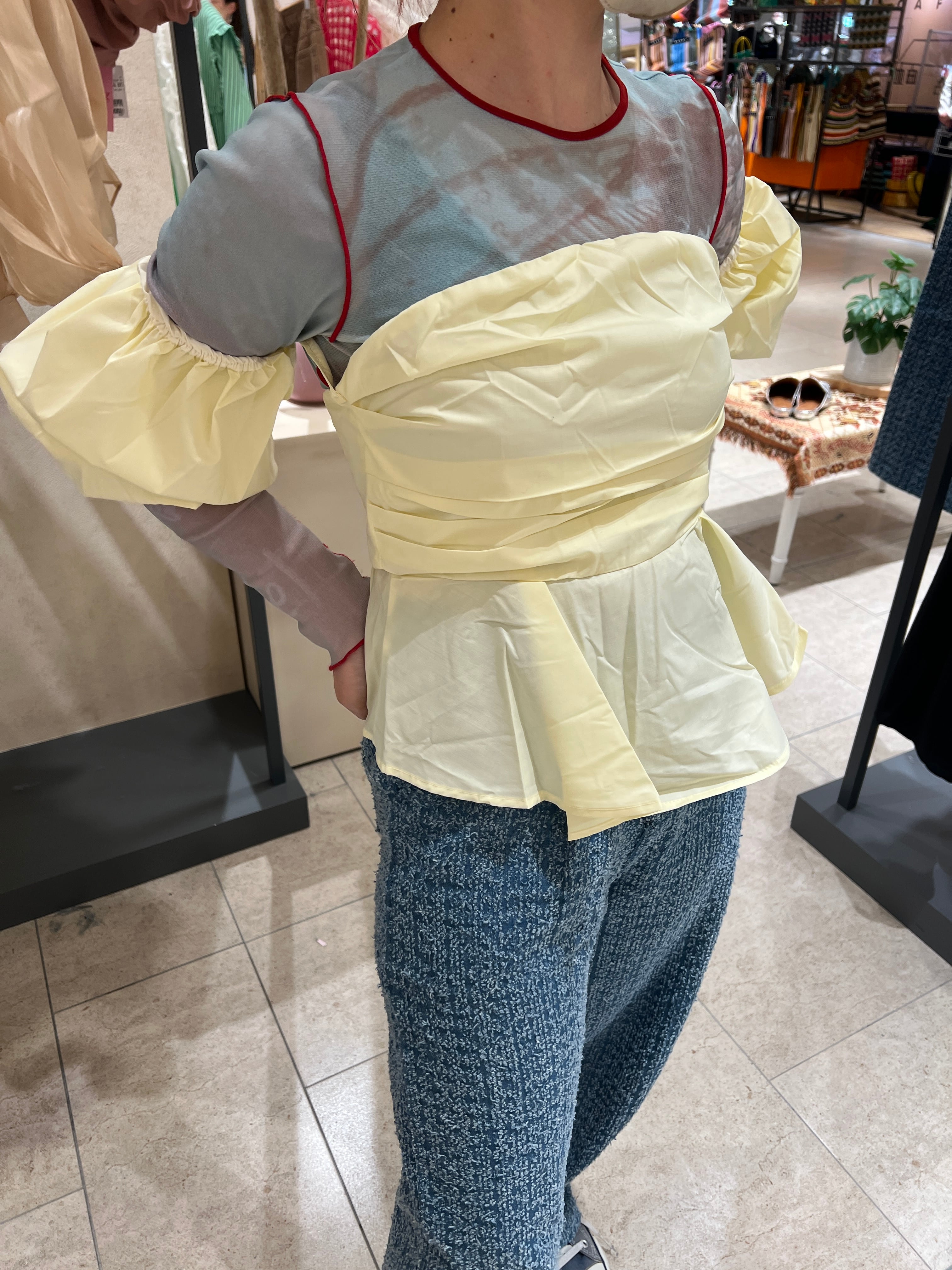 パフ袖とタック入りのビスチェがくっついたトップス。