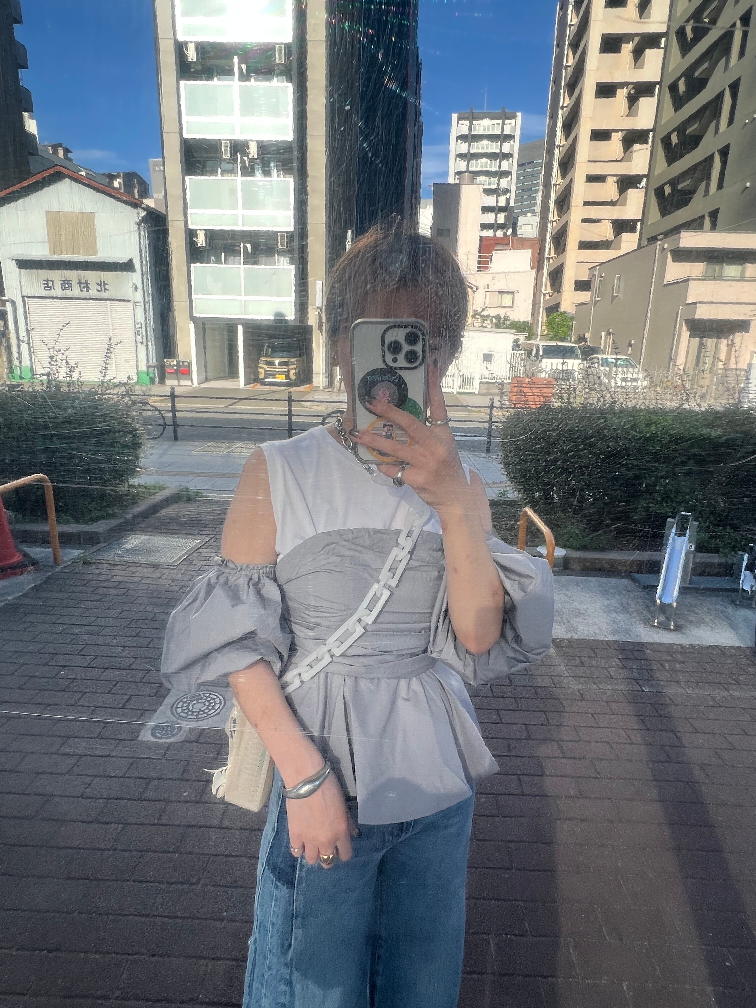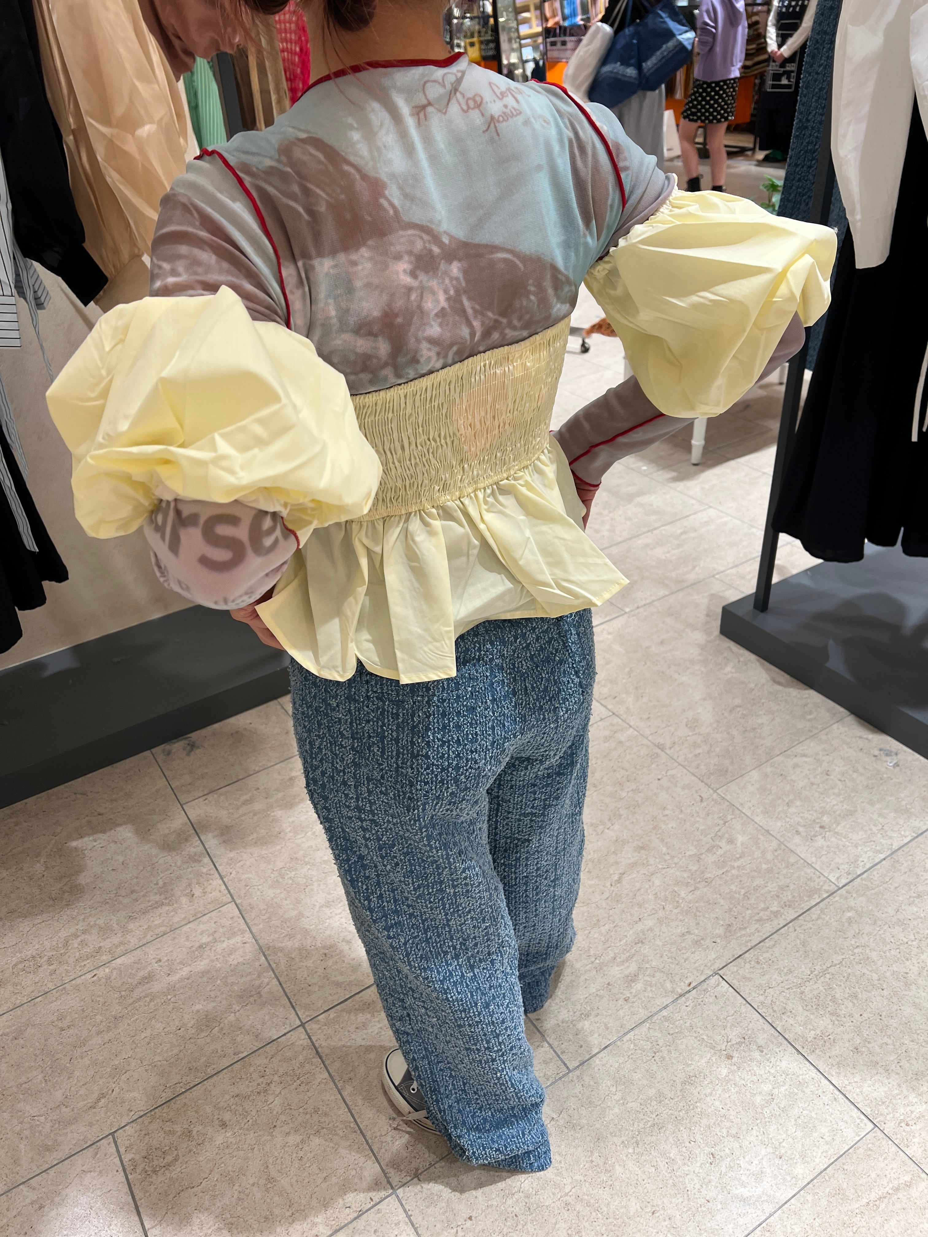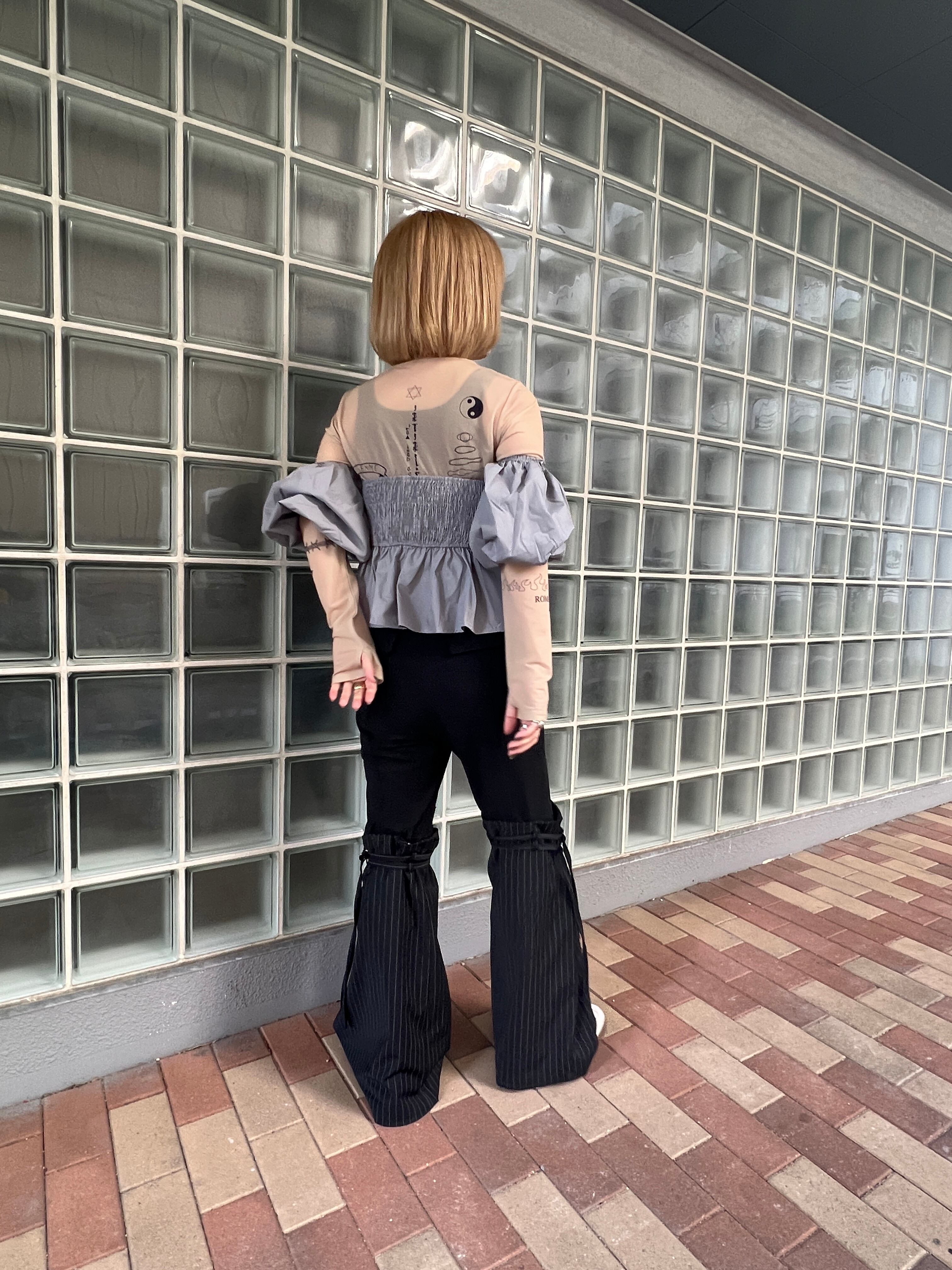 パフ袖とタック入りのビスチェがくっついたトップス。