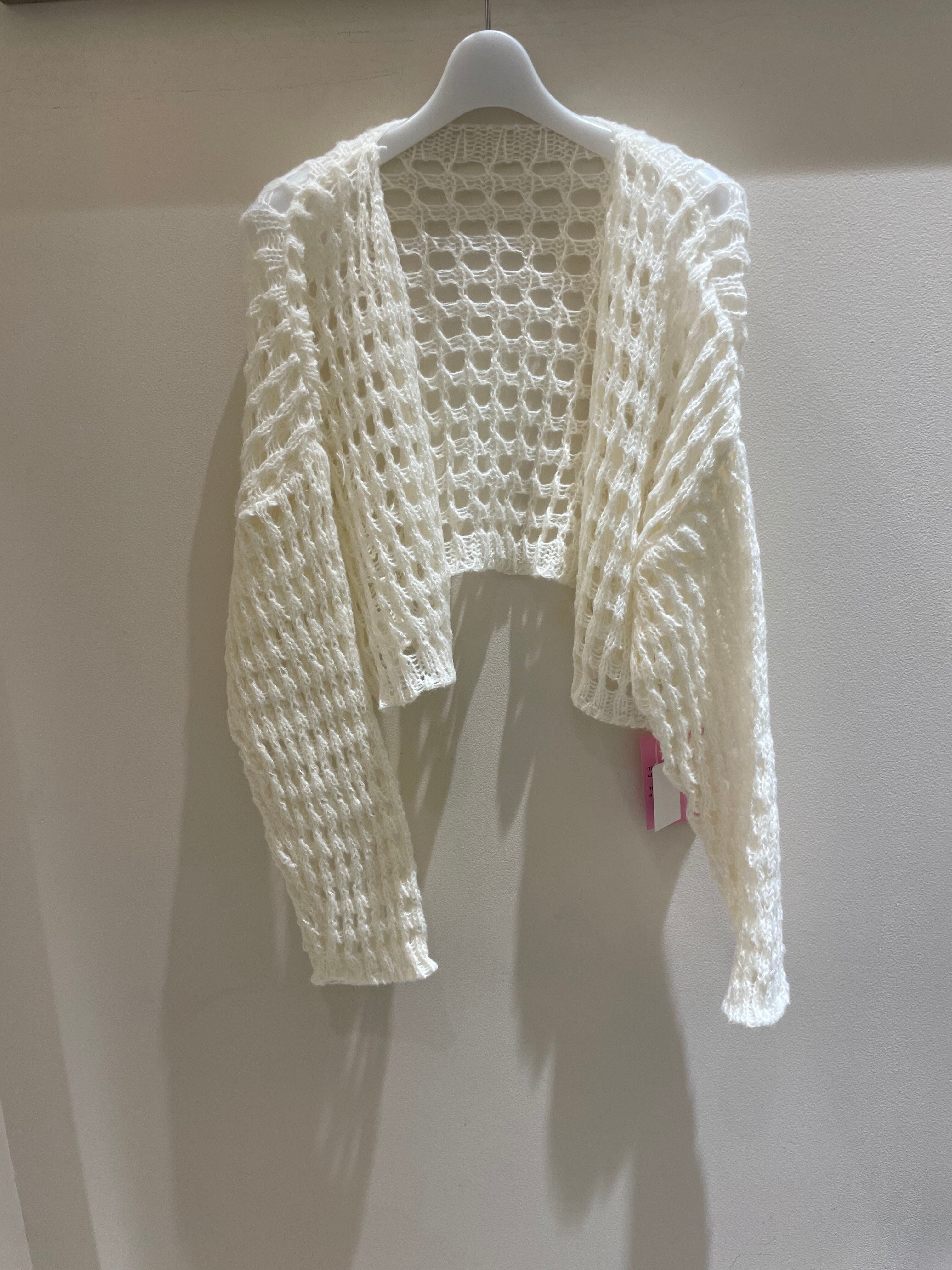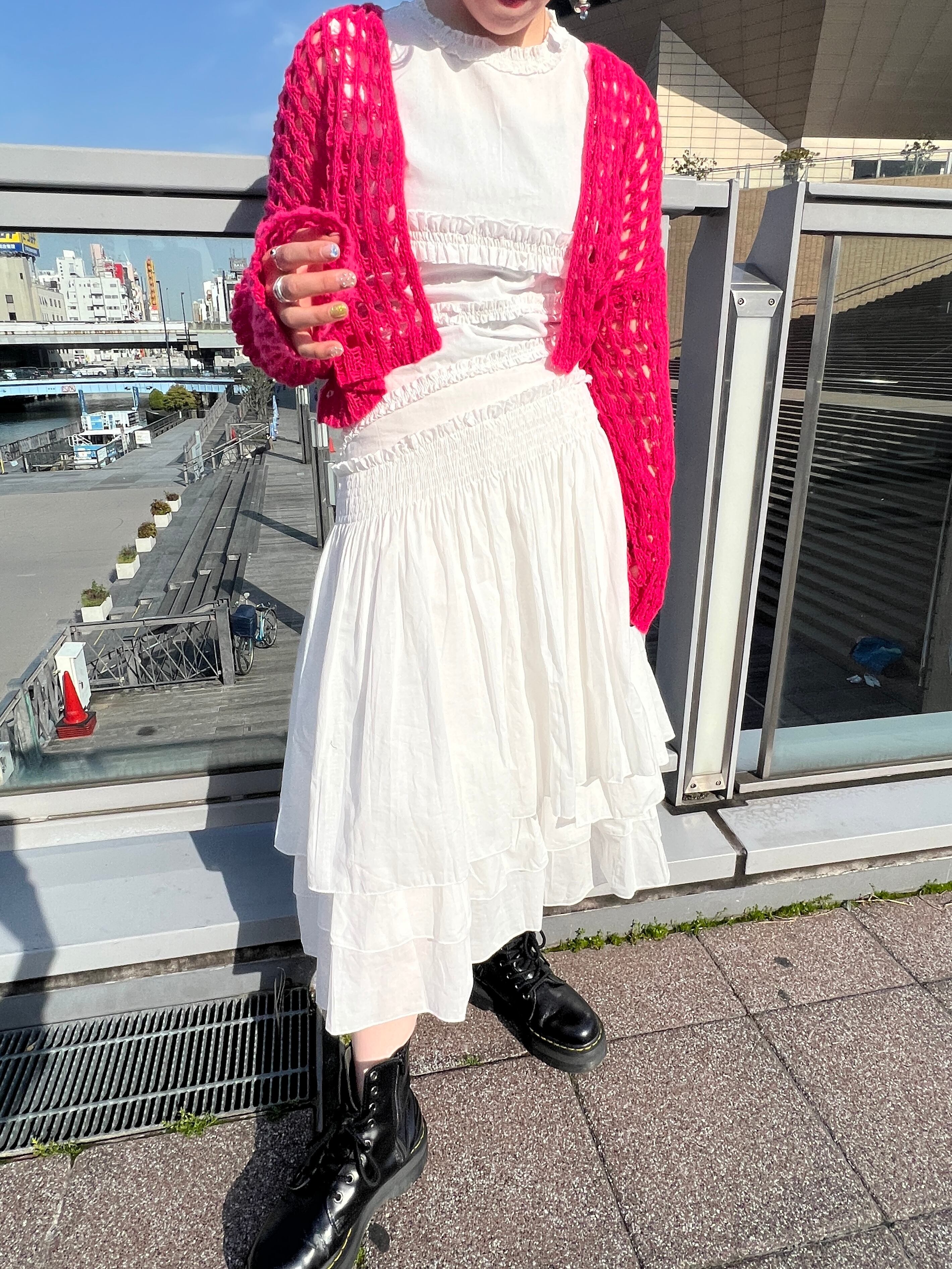 クロップド丈なのでバランスが取りやすく、どんなコーデにも合わせやすいカーディガンです。
