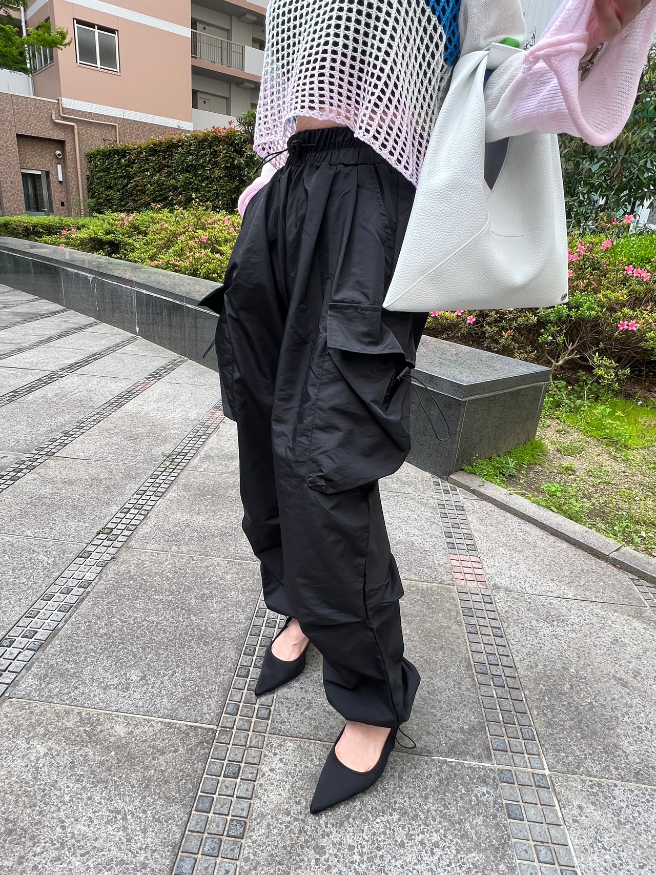 さらっとした軽い着心地のしゃかしゃかパンツで、ウエストは総ゴムでドローコードつき。