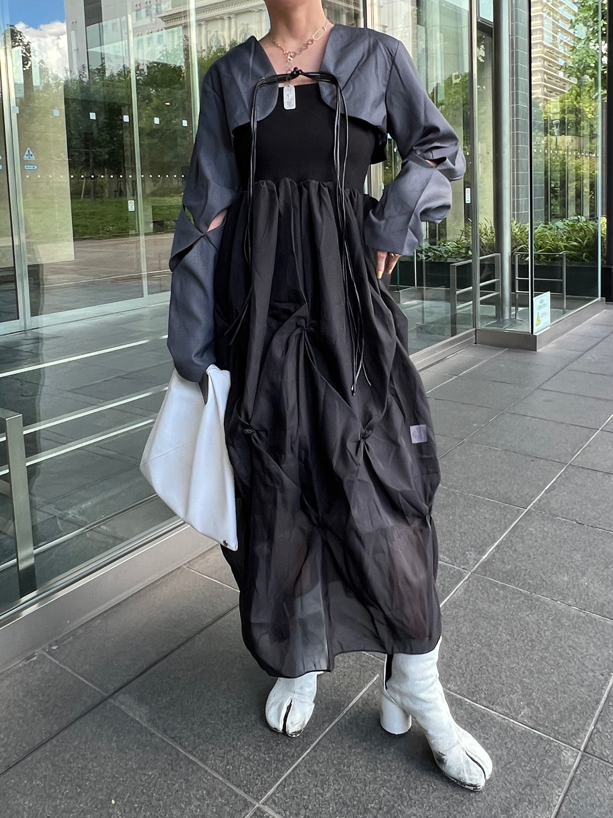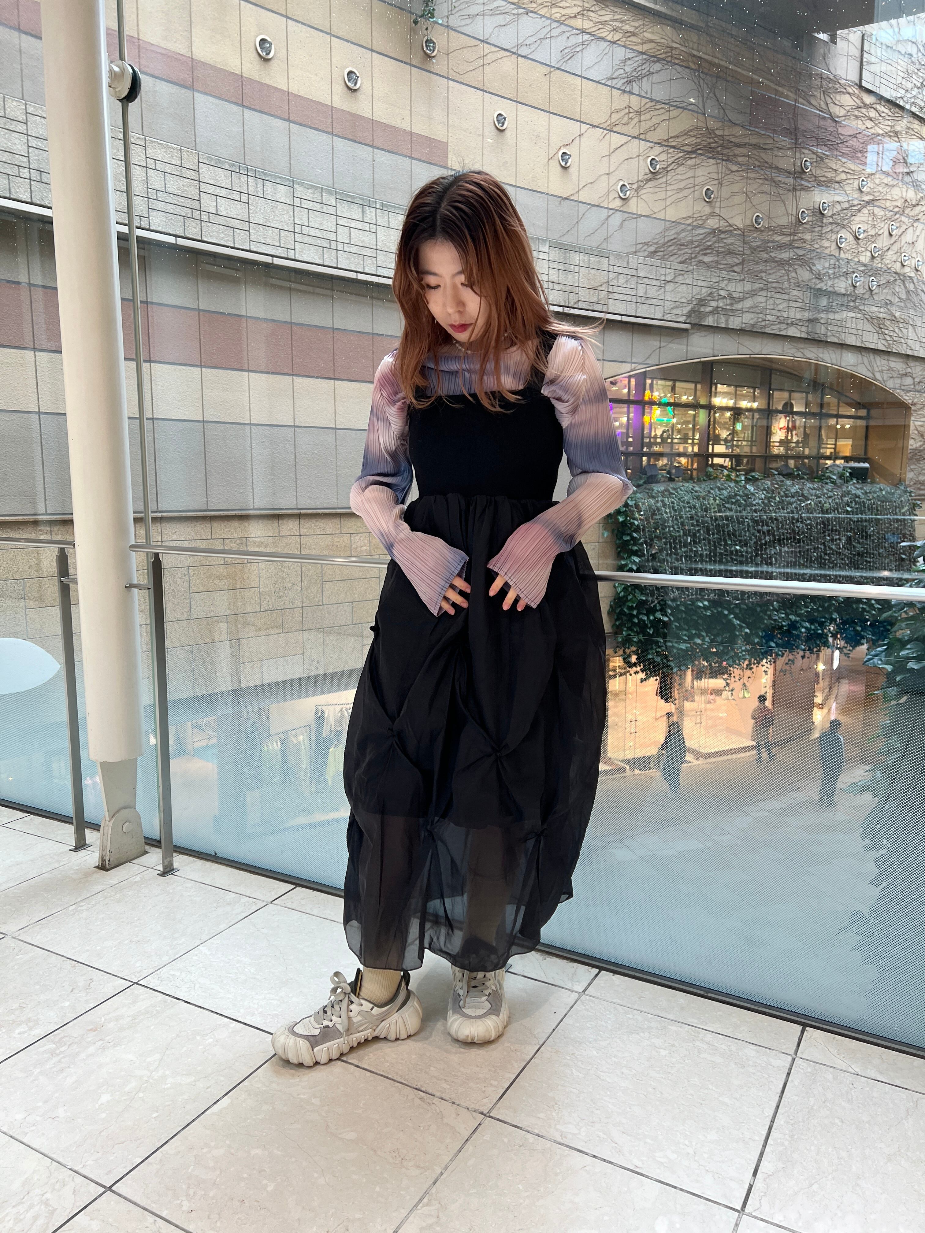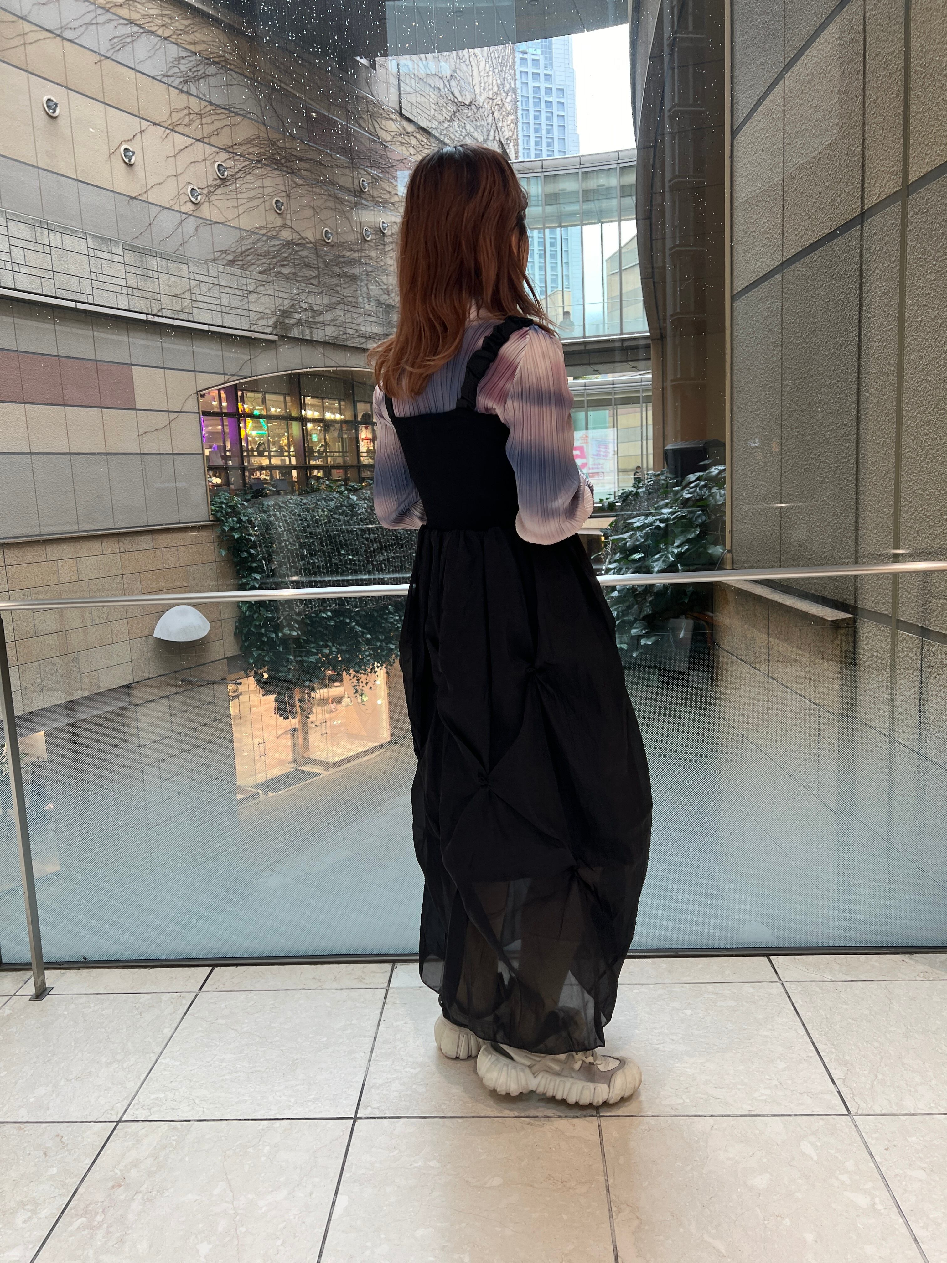 胸元はリブ素材、スカート部分はほんのり透け感のあるシアー(裏地あるのでお下着は見えません)、タックデザインが上品でコーデをぐっと高みえしてくれます。