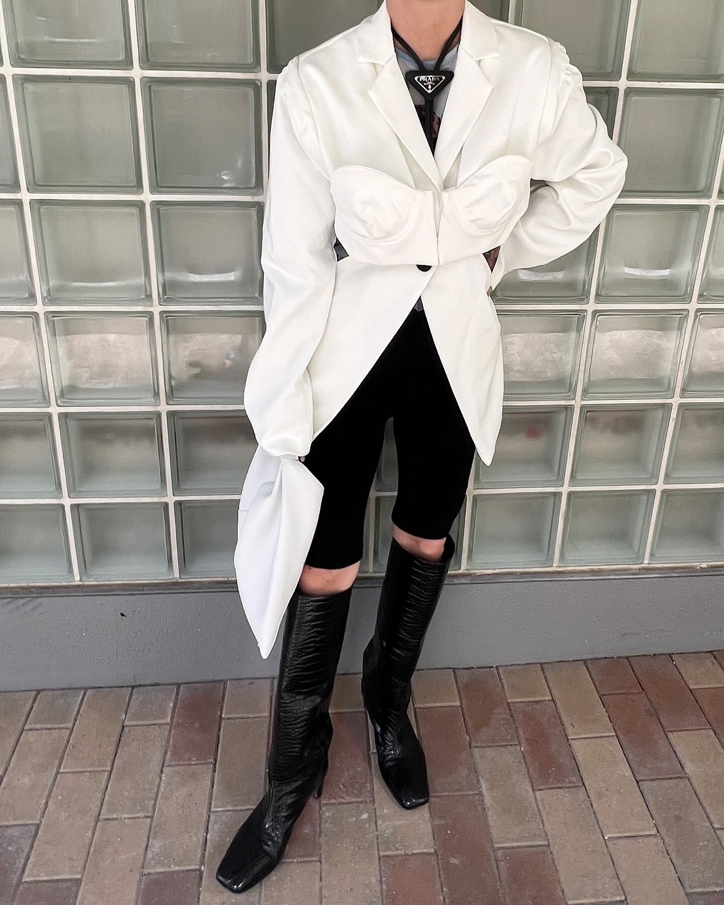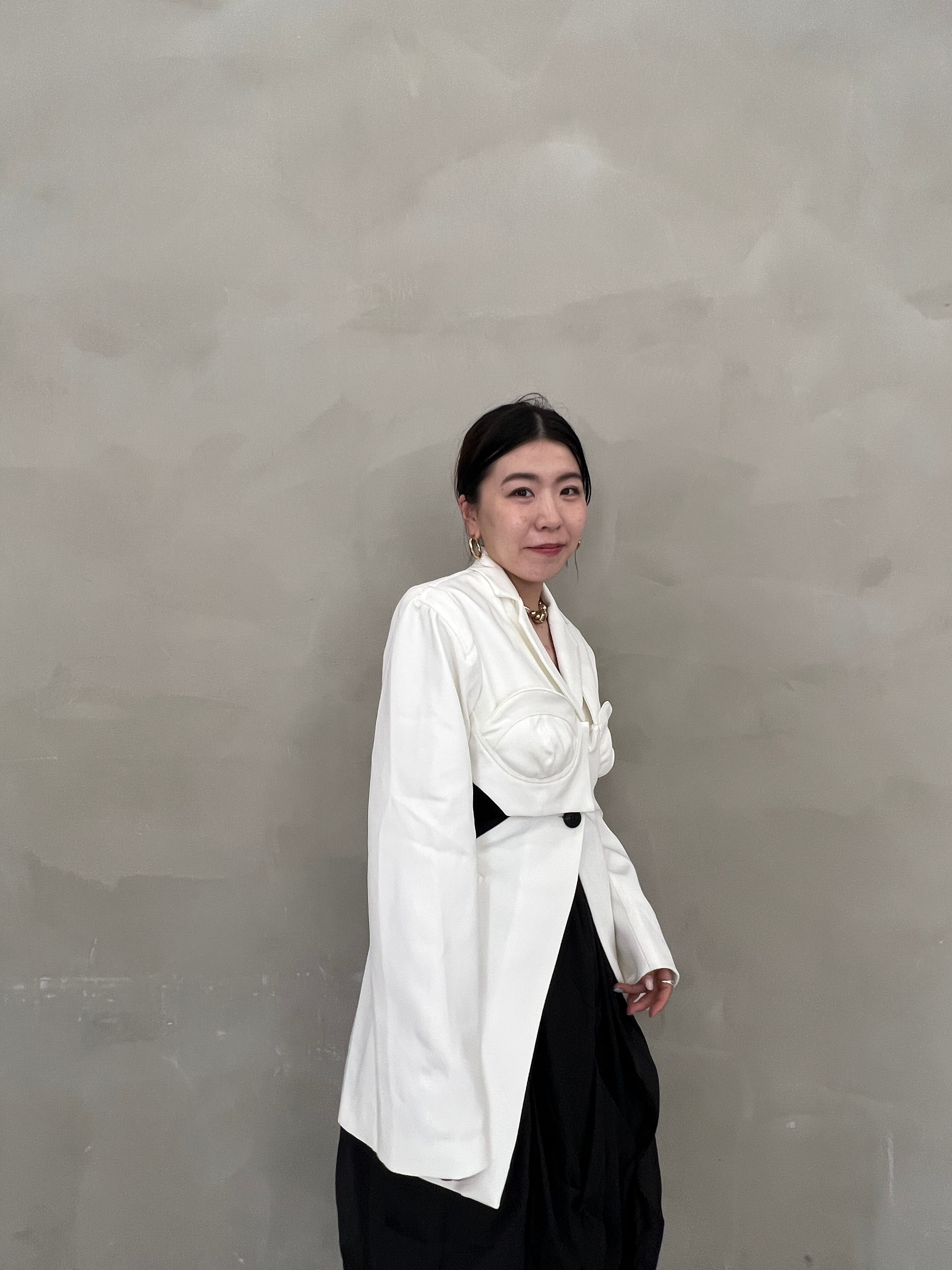 ビスチェをレイヤードしているかのようなテーラードジャケット。ビスチェ部分はホックになっているので着脱楽々です。