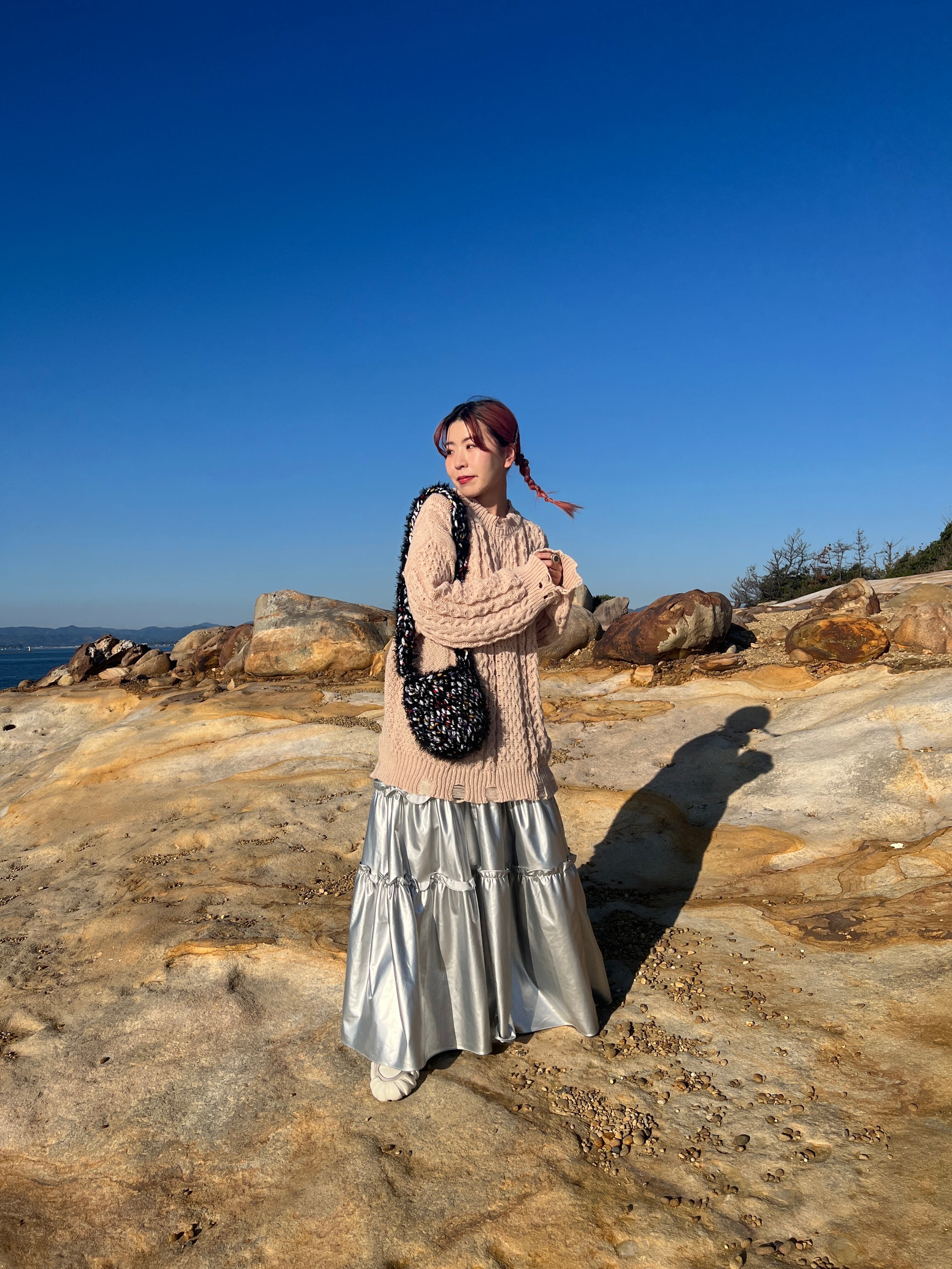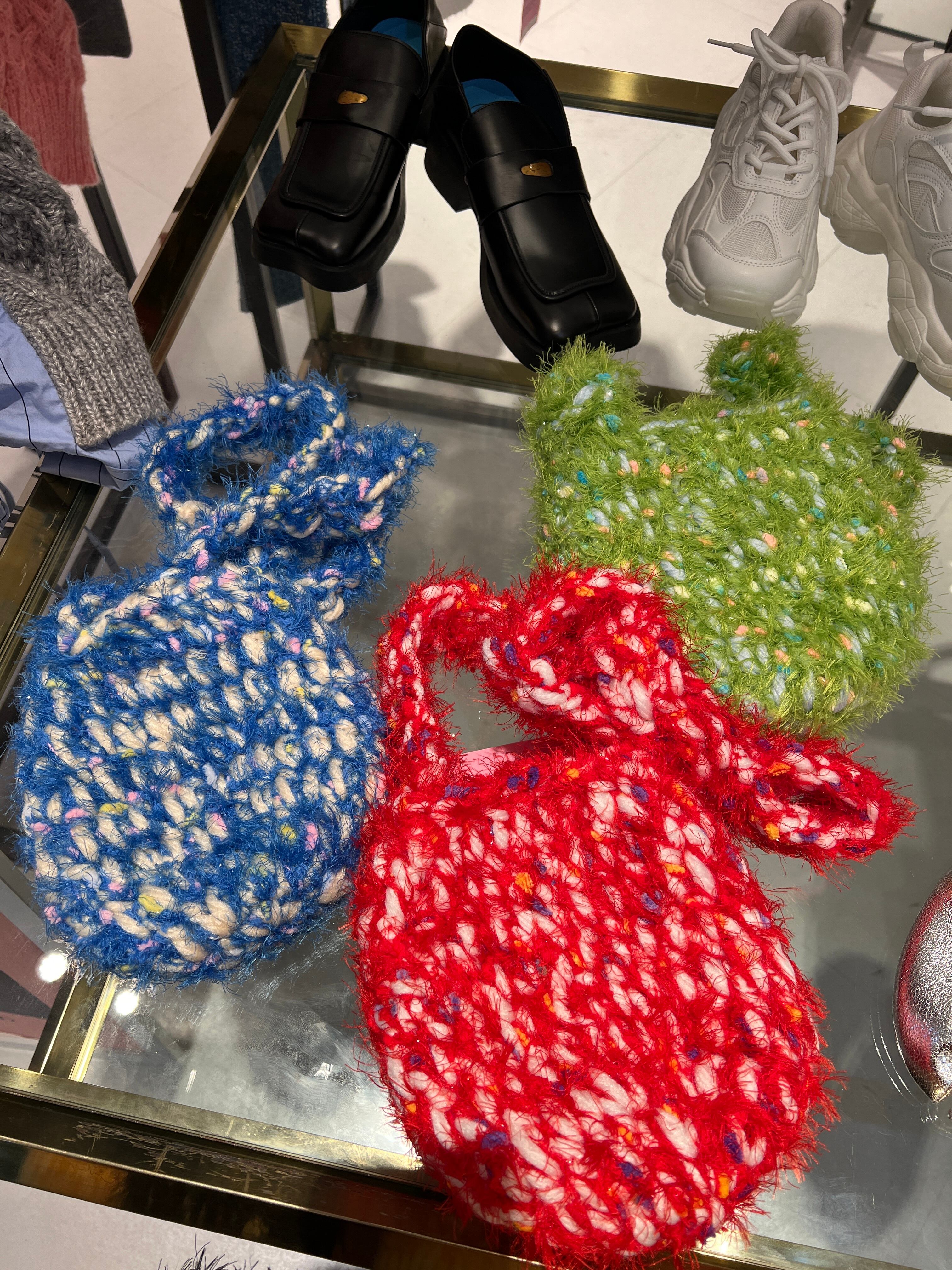 キラキラした糸も編まれておりめっちゃ映えるバッグです。ふわふわもこもこのかわいいニットバッグ。スマホと4つ折り財布がすっぽり収まります。