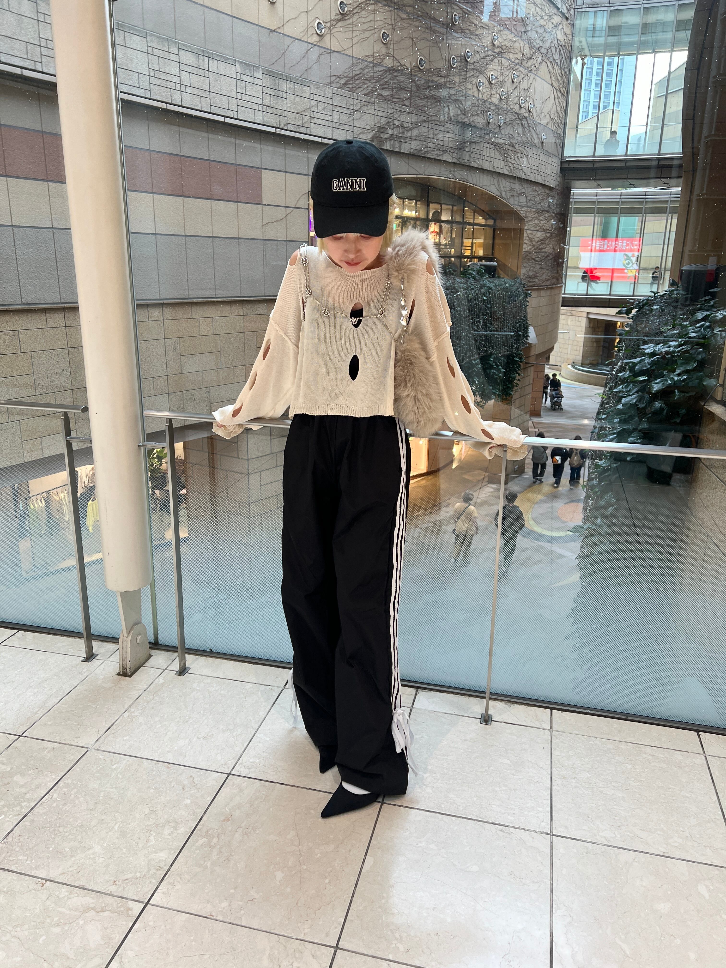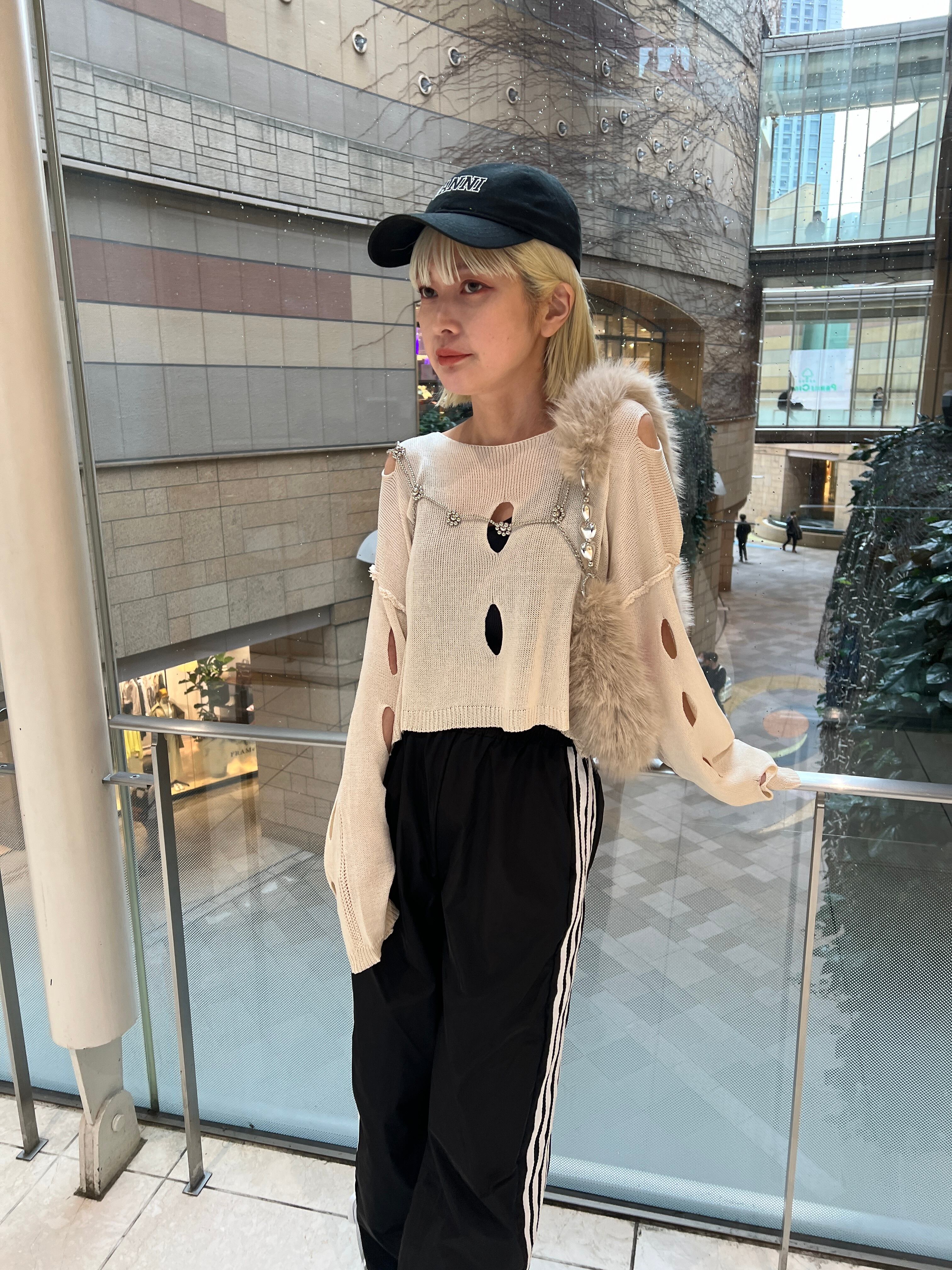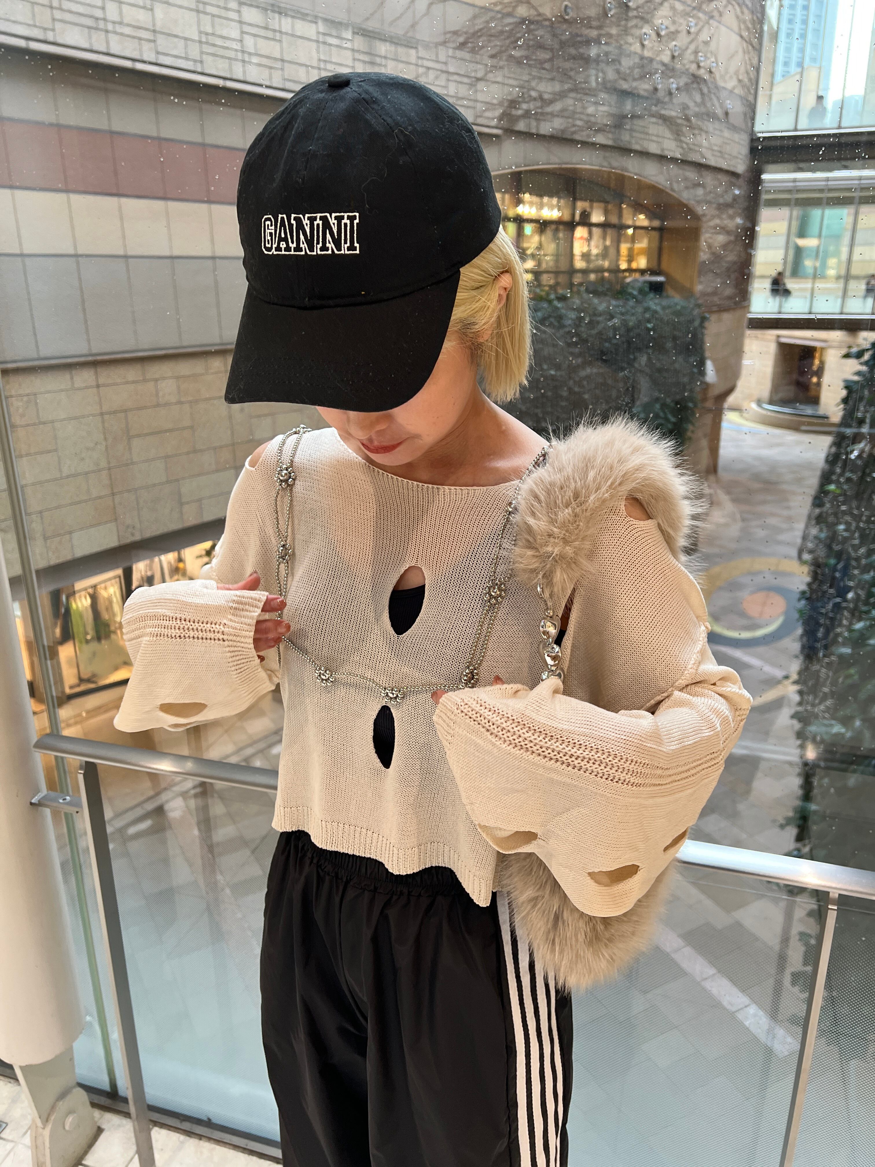 ユニークなホールデザインが目を引く夏ニット、品番1024。涼しげな見た目と通気性の良さが魅力で、夏の装いにぴったりの一着です。シンプルなデザインながら、ホールがアクセントとなりおしゃれ度がグッとアップします。